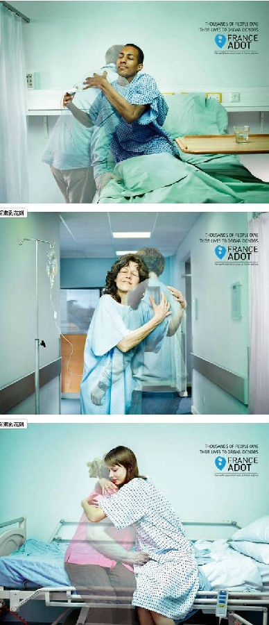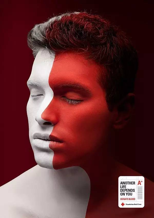 呼吁献血海报:画面一半用代表生命的血红色,一半用代表死亡的惨白色。文案则是:另一个人的生命,就掌握在你的手中。